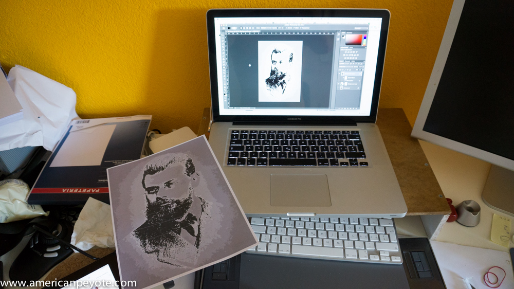 Since I learned about stencil street art on my last trip to Berlin I’ve been tossing some project ideas around in my mind. One was sparked by the idea of exhibiting an art piece at the Berlin Tech Open Air, where I could have set up an installation in a fine abandoned building. The big concept for the installation revolved around integrating a stencil project with the duality between scientific controversy and the type of revolution themes that street art is built around. There would be an augmented reality app to integration with the installation, but the center piece would be using street art techniques to highlight figures and revolutionary or controversial ideas and figures from science history. One on my favorites is Ludwig Boltzmann. So I searched for some images of Dr. Boltzmann, went through some tutorials on stencil creation using Photoshop, and did a quick test. The project is growing and more of it is coming each week.